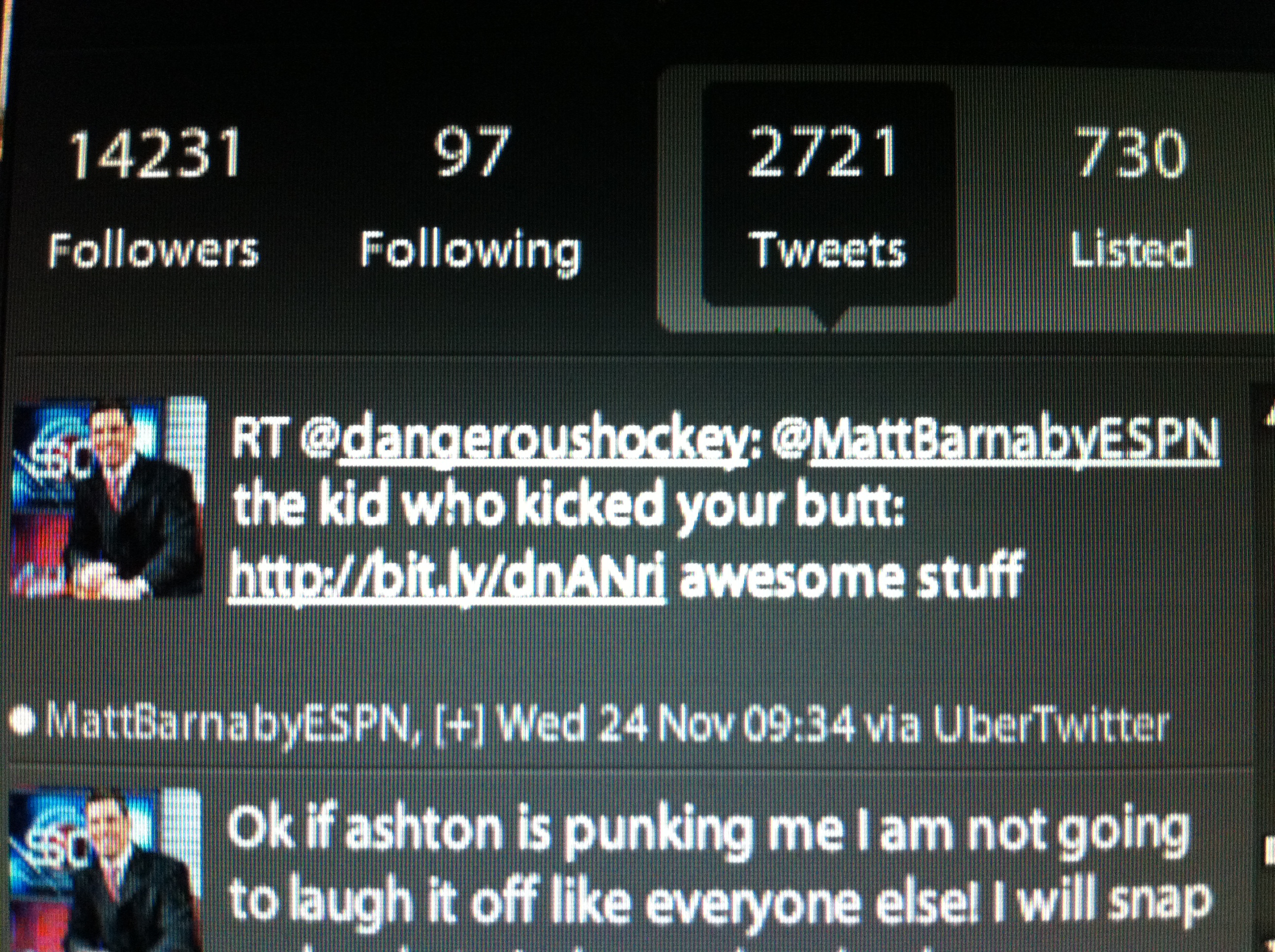 The Ex NHL player turned ESPN analyst after a series of unfortunate tweets by dangeroushockey to Barnaby and a group of his friends. “Shit, I thought the guy enjoyed my tweets. He RE tweeted 2 for crying out loud saying he LOVED THEM. Now he appears to hate my guts.” said DH senior editor any Rocque Trem early Sunday. Although judging by his history he has a hot temper (fight with best friend?)